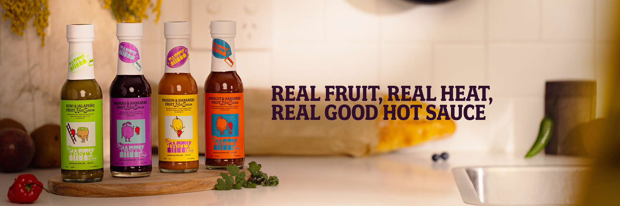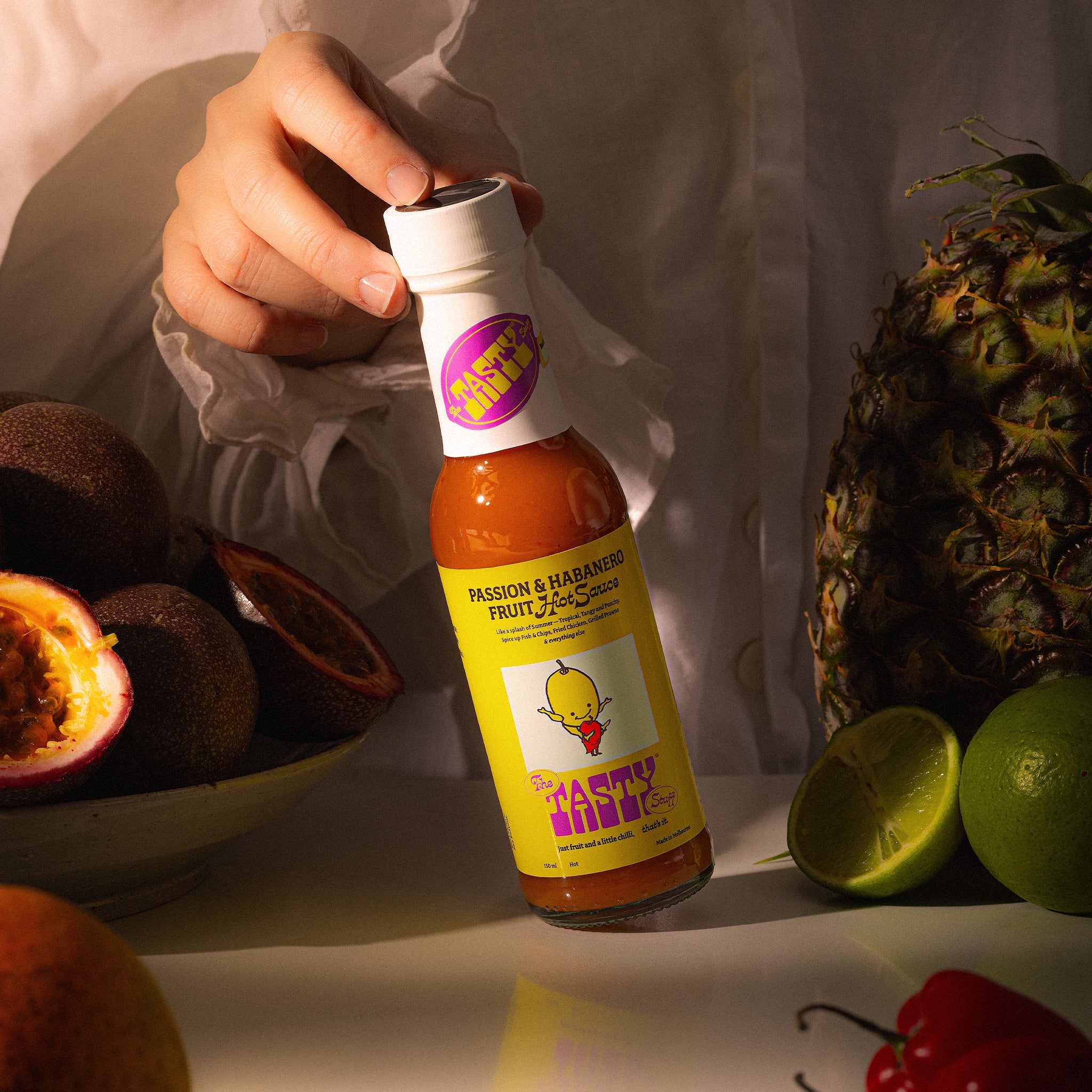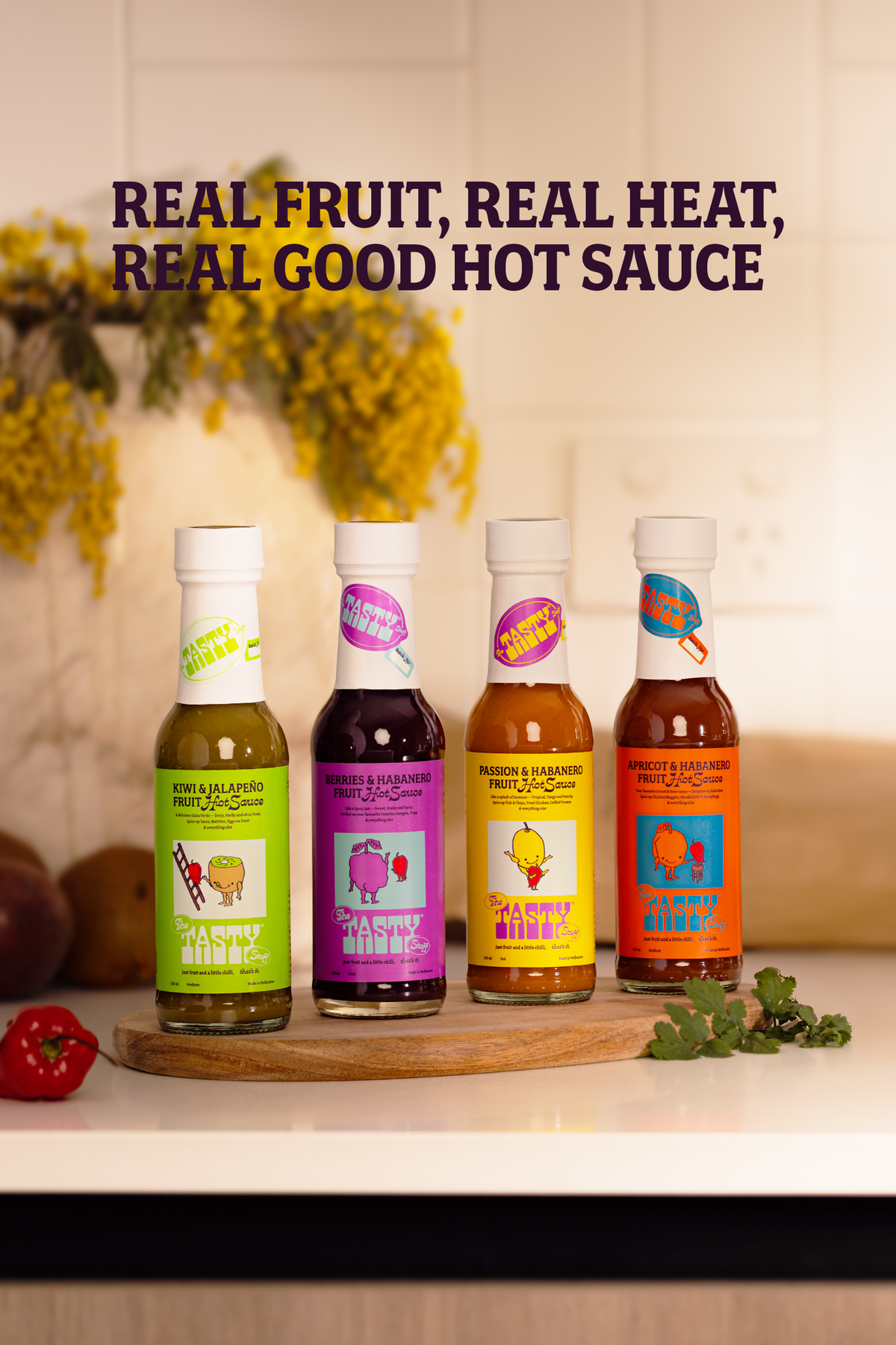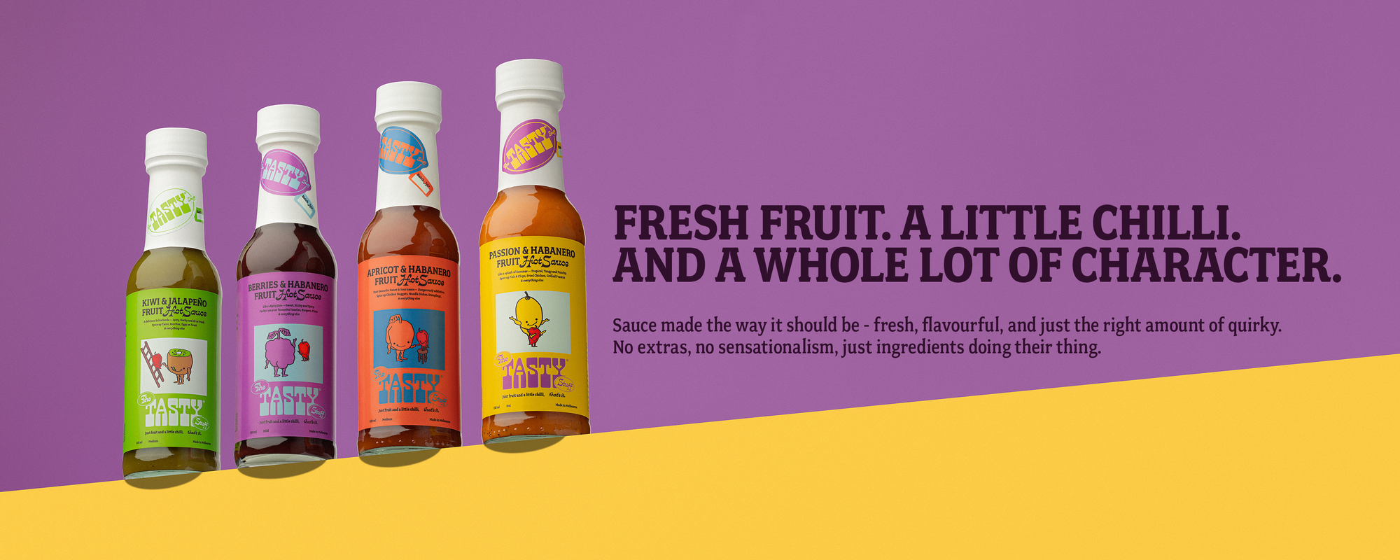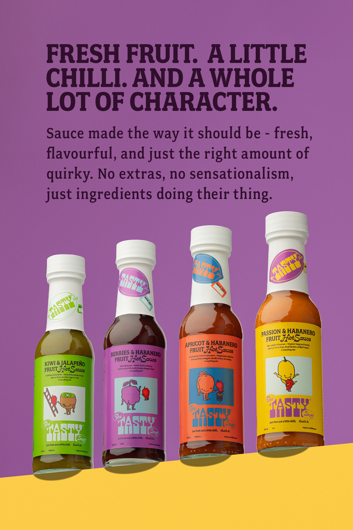 Each bottle is just fresh fruit and a little chilli, doing what they do best. Sweet, tangy, bold, or bright - they're all a bit weird in the best way.